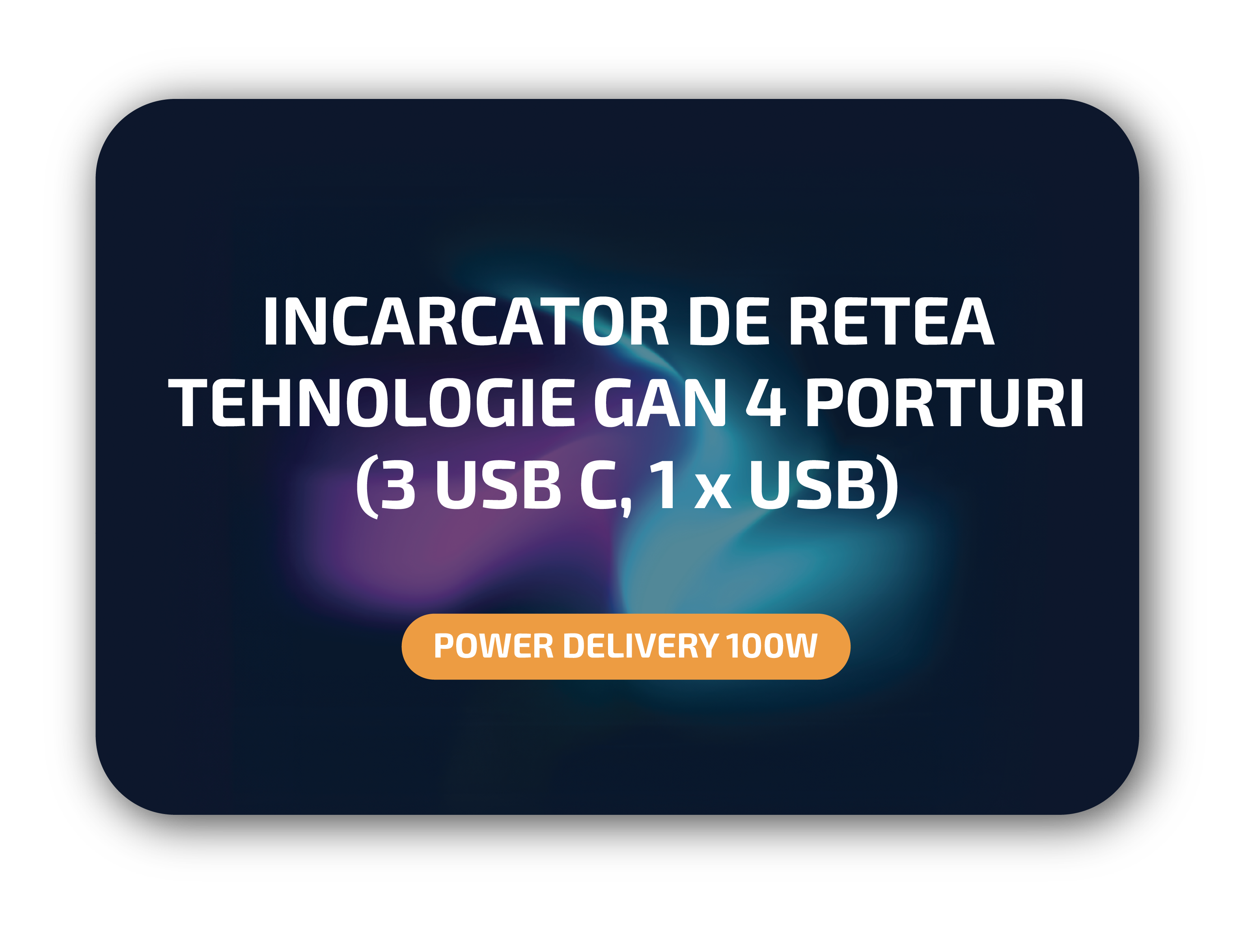 Acest incarcator de retea impresioneaza cu patru porturi de incarcare, trei porturi USB-C si un port USB, oferindu-va posibilitatea de a incarca simultan mai multe dispozitive in acelasi timp. Cele trei porturi USB-C sunt echipate cu tehnologia Power Delivery (PD), care asigura o gestionare inteligenta a puterii si livrarea eficienta a energiei pentru dispozitivele dvs. compatibile. Cu o capacitate de incarcare impresionanta de 100W, acest incarcator va permite sa reincarcati rapid telefoanele, tabletele, laptopurile si alte dispozitive esentiale.