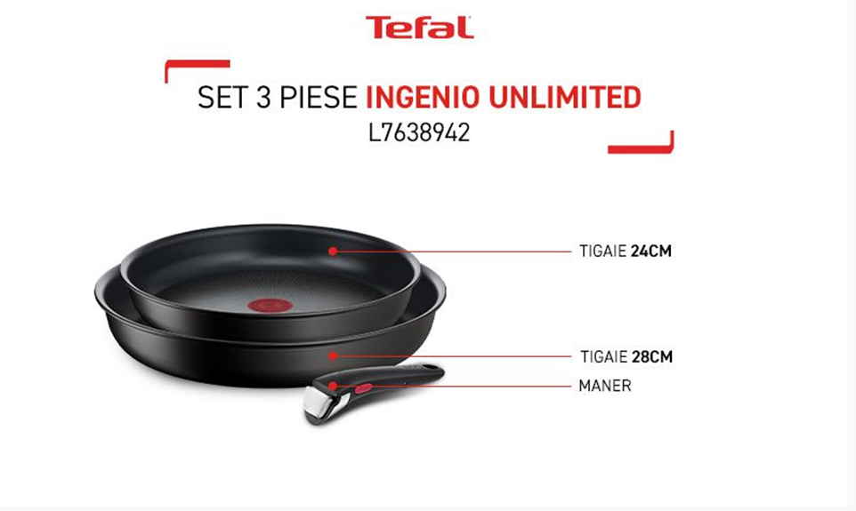Set 3 piese TEFAL Ingenio Unlimited L7638942, maner detasabil, invelis antiaderent Titan, inductie, negru